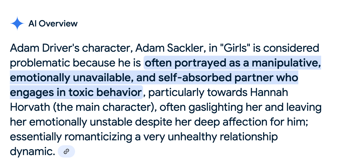 Driver plays the toxic boyfriend character an awful lot. In addition to his roles in Star Wars and Marriage Story, there was his breakout performance as Lena Dunham’s love interest in Girls — and I haven’t seen Girls, but I absolutely did ask Google’s creepy AI whether his performance in Girls was on brand, and received the following reply: