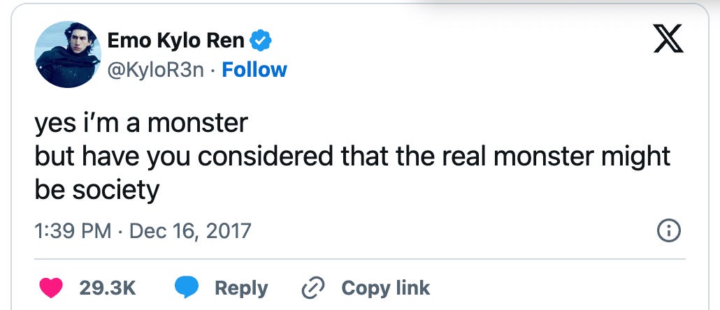 In Star Wars, Kylo Ren is a Sith Lord, an architect and instrument of a fascist, genocidal Empire, a vast system of oppression. But he’s also Ben Solo, a human being who loves and suffers, who relates and is relatable. And Rey’s prime motive — along with, you know, saving the galaxy — is to liberate Ben, and his potent spark of humanity, from the death cult of the Empire.